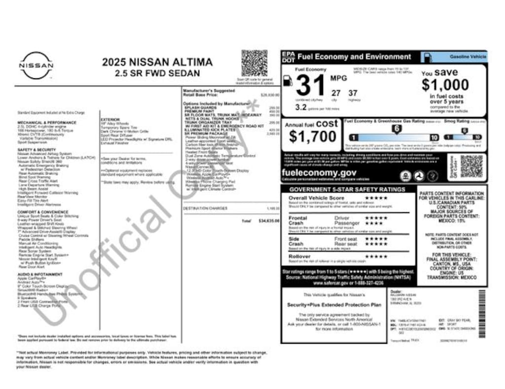 CVT with Xtronic, 4-Wheel Disc Brakes, 6 Speakers, ABS brakes, Air Conditioning, Alloy wheels, AM/FM radio: SiriusXM, Auto High-beam Headlights, Blind Spot Warning, Brake assist, Bumpers: body-color, Delay-off headlights, Driver door bin, Driver vanity mirror, Dual front impact airbags, Dual front side impact airbags, Electronic Stability Control, Four wheel independent suspension, Front anti-roll bar, Front Bucket Seats, Front Center Armrest, Front reading lights, Fully automatic headlights, Illuminated entry, Knee airbag, Leather Shift Knob, Low tire pressure warning, NissanConnect featuring Apple CarPlay and Android Auto, Occupant sensing airbag, Outside temperature display, Overhead airbag, Overhead console, Panic alarm, Passenger door bin, Passenger vanity mirror, Power door mirrors, Power driver seat, Power steering, Power windows, Radio data system, Radio: AM/FM Audio System, Rear anti-roll bar, Rear Parking Sensors, Rear reading lights, Rear seat center armrest, Rear side impact airbag, Rear window defroster, Remote keyless entry, Security system, Speed control, Speed-sensing steering, Speed-Sensitive Wipers, Split folding rear seat, Sport Seat Trim, Steering wheel mounted audio controls, Tachometer, Telescoping steering wheel, Tilt steering wheel, Traction control, Trip computer, Unique Sport Seats, Variably intermittent wipers, Wheels: 19" Sport Machined Alloy, CVT with Xtronic.