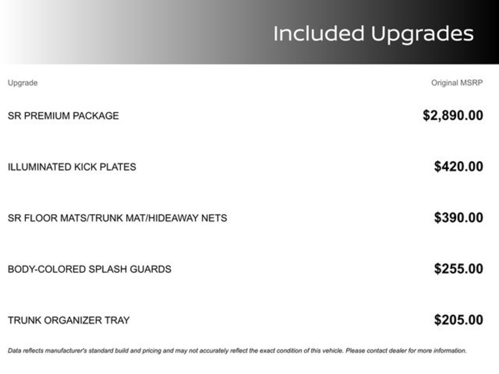 CVT with Xtronic, 2-Way Driver Power Lumbar Support, 4-Way Power Passenger Seat, 4-Wheel Disc Brakes, 6 Speakers, ABS brakes, Air Conditioning, Alloy wheels, AM/FM radio: SiriusXM, Auto High-beam Headlights, Blind Spot Warning, Body-Colored Splash Guards, Brake assist, Bumpers: body-color, Delay-off headlights, Driver door bin, Driver vanity mirror, Dual front impact airbags, Dual front side impact airbags, Dual Zone Automatic HVAC, Electronic Stability Control, Four wheel independent suspension, Front anti-roll bar, Front Bucket Seats, Front Center Armrest, Front reading lights, Fully automatic headlights, Heated Front Seats, Illuminated entry, Illuminated Kick Plates, Knee airbag, Leather Shift Knob, Leather-Appointed Seat Trim, Low tire pressure warning, NissanConnect, NissanConnect featuring Apple CarPlay and Android Auto, Occupant sensing airbag, Outside temperature display, Overhead airbag, Overhead console, Panic alarm, Passenger door bin, Passenger vanity mirror, Power door mirrors, Power driver seat, Power steering, Power windows, Premium Sport Interior Finishers, Radio data system, Radio: AM/FM Audio System, Rear anti-roll bar, Rear Parking Sensors, Rear reading lights, Rear seat center armrest, Rear side impact airbag, Rear window defroster, Remote Engine Start w/Intelligent Climate Control, Remote keyless entry, Security system, Single Panel Moonroof, Speed control, Speed-sensing steering, Speed-Sensitive Wipers, Split folding rear seat, Sport Seat Trim, SR Floor Mats/Trunk Mat/Hideaway Nets, SR Premium Package, Steering wheel mounted audio controls, Tachometer, Telescoping steering wheel, Tilt steering wheel, Traction control, Trip computer, Trunk Organizer Tray, Unique Sport Seats, Variably intermittent wipers, Wheels: 19" Sport Machined Alloy, CVT with Xtronic.