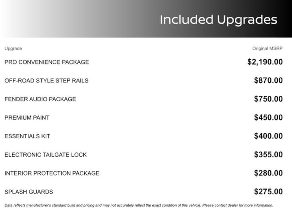 4WD, 120V Power Outlet in Bed, 120V Power Outlet in Rear Center Console, 17" Painted Alloy Wheels, 3.692 Axle Ratio, 4-Wheel Disc Brakes, 6 Speakers, ABS brakes, Air Conditioning, Alloy wheels, AM/FM radio: SiriusXM, Anti-whiplash front head restraints, Auto High-beam Headlights, Automatic temperature control, Bed Under-Rail Lighting, Blind Spot Warning, Brake assist, Bumpers: body-color, Delay-off headlights, Driver door bin, Driver vanity mirror, Dual front impact airbags, Dual front side impact airbags, Electronic Stability Control, Electronic Tailgate Lock, Emergency communication system, Essentials Kit, Fender Audio Package, Fender Premium Audio System w/10 Speakers, Front anti-roll bar, Front Bucket Seats, Front Center Armrest, Front dual zone A/C, Front fog lights, Front reading lights, Front wheel independent suspension, Fully automatic headlights, Heated Front Seats, Heated Outside Mirrors, Heated Steering Wheel, Illuminated entry, Intelligent Around View Monitor (I-AVM), Interior Protection Package, Knee airbag, Leather Shift Knob, Leather steering wheel, Low tire pressure warning, NissanConnect Services & Wi-Fi Hotspot Delete, Occupant sensing airbag, Off-Road Style Step Rails, Overhead airbag, Overhead console, Panic alarm, Partial Under-Seat Storage Delete, Passenger door bin, Passenger vanity mirror, Power door mirrors, Power driver seat, Power passenger seat, Power steering, Power windows, Premium Paint, PRO Convenience Package, PRO Embroidered Premium Cloth Seat Trim, PRO-4X Carpeted Floor Mats (DISC), Radio data system, Radio: SXM/AM/FM/AUX/USB Audio System, Rear anti-roll bar, Rear seat center armrest, Rear side impact airbag, Rear step bumper, Remote Engine Starter, Remote keyless entry, Security system, Speed control, Speed-sensing steering, Splash Guards (DISC), Split folding rear seat, Spray-In Bedliner, Steering wheel mounted audio controls, Tachometer, Telematics Delete Package, Telescoping steering wheel, Tilt steering wheel, Tow Package (T11) (DISC), Traction control, Trailer Hitch w/Wiring Harness, Trip computer, Utili-Track System, Variably intermittent wipers, Voltmeter, Wireless Apple CarPlay/Wireless Android Auto, Wireless Charging for Personal Devices, 4WD.
