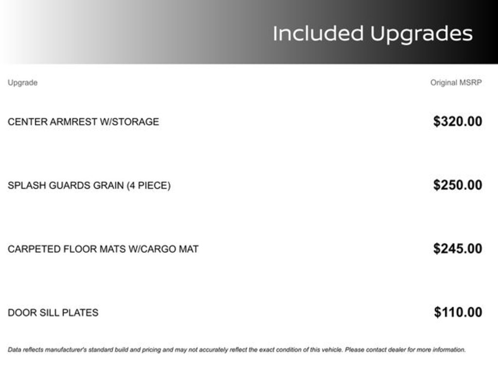 MSRP is the Manufacturer's Suggested Retail Price (MSRP) of the vehicle. It does not include any taxes, fees or other charges. Pricing and availability may vary based on a variety of factors, including options, dealer, specials, fees, and financing qualifications. Consult your dealer for actual price and complete details. Prices do not include dealer charges (which may vary by manufacturer or region), or other costs for selling, preparing, displaying or financing the vehicle. Dealer will not honor pricing errors displayed here. A dealer documentary service fee of $988 will be added to the sales/lease price of vehicle. *Price amount shown includes Mfg. incentives, additional incentives can include, (Military, College Grad, Valued Owner or Competitive Owner). Offers, incentives, discounts and financing are subject to expiration and other restrictions. Customer must finance with dealer, see dealer for qualifications and complete details.
