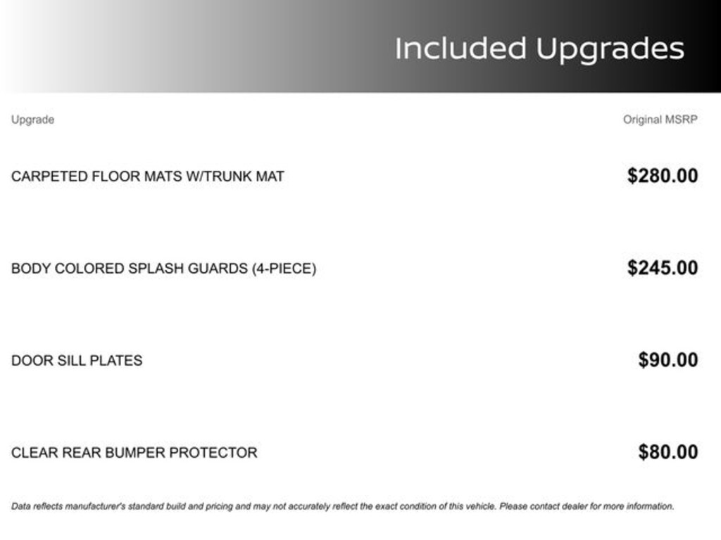 MSRP is the Manufacturer's Suggested Retail Price (MSRP) of the vehicle. It does not include any taxes, fees or other charges. Pricing and availability may vary based on a variety of factors, including options, dealer, specials, fees, and financing qualifications. Consult your dealer for actual price and complete details. Prices do not include dealer charges (which may vary by manufacturer or region), or other costs for selling, preparing, displaying or financing the vehicle. Dealer will not honor pricing errors displayed here. A dealer documentary service fee of $988 will be added to the sales/lease price of vehicle. *Price amount shown includes Mfg. incentives, additional incentives can include, (Military, College Grad, Valued Owner or Competitive Owner). Offers, incentives, discounts and financing are subject to expiration and other restrictions. Customer must finance with dealer, see dealer for qualifications and complete details.