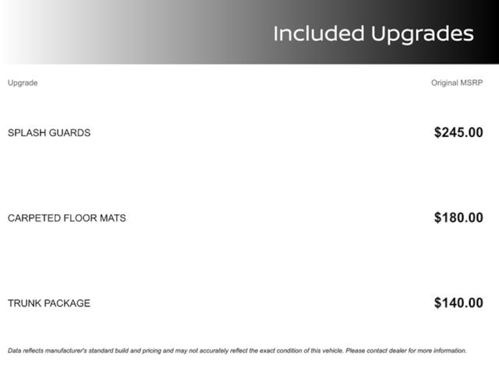 MSRP is the Manufacturer's Suggested Retail Price (MSRP) of the vehicle. It does not include any taxes, fees or other charges. Pricing and availability may vary based on a variety of factors, including options, dealer, specials, fees, and financing qualifications. Consult your dealer for actual price and complete details. Prices do not include dealer charges (which may vary by manufacturer or region), or other costs for selling, preparing, displaying or financing the vehicle. Dealer will not honor pricing errors displayed here. A dealer documentary service fee of $988 will be added to the sales/lease price of vehicle. *Price amount shown includes Mfg. incentives, additional incentives can include, (Military, College Grad, Valued Owner or Competitive Owner). Offers, incentives, discounts and financing are subject to expiration and other restrictions. Customer must finance with dealer, see dealer for qualifications and complete details.