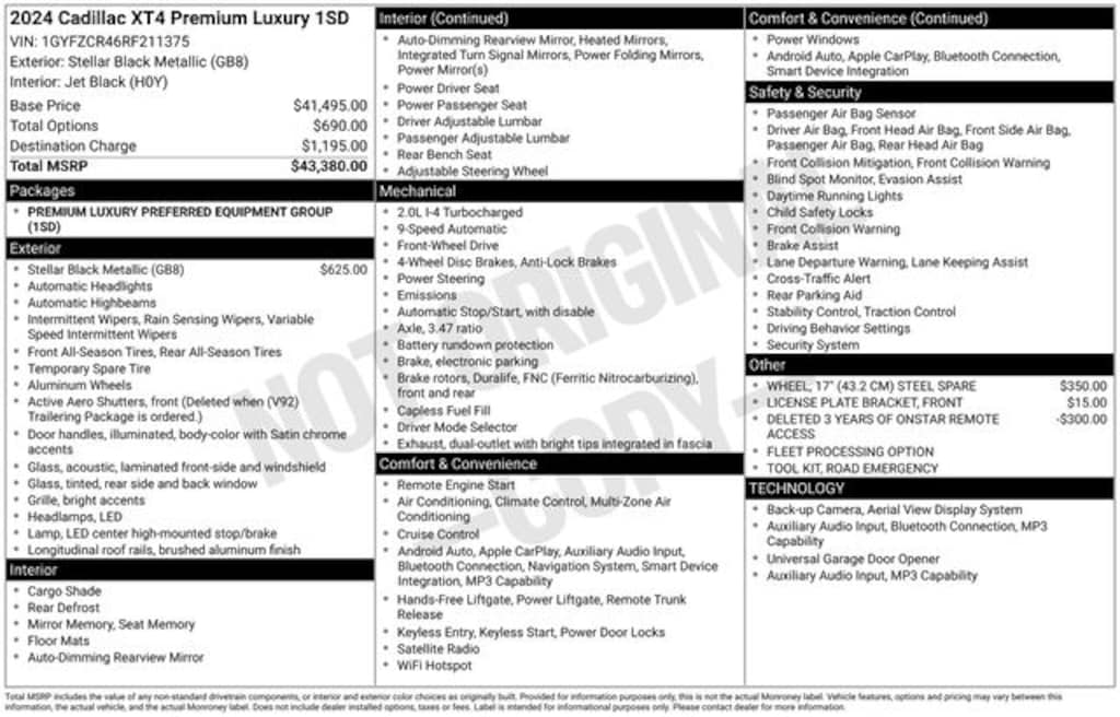 3.47 Axle Ratio, 4-Way Driver Seat Power Lumbar Control, 4-Way Passenger Seat Power Lumbar Control, 4-Wheel Disc Brakes, 6-Way Power Passenger Seat Adjuster, 7 Speakers, 7-Speaker Audio System, 8-Way Power Driver Seat Adjuster, ABS brakes, Air Conditioning, Alloy wheels, AM/FM radio: SiriusXM with 360L, Apple CarPlay/Android Auto, Auto High-beam Headlights, Auto-dimming door mirrors, Auto-Dimming Inside Rear-View Mirror, Auto-dimming Rear-View mirror, Automatic Emergency Braking, Automatic temperature control, Brake assist, Bumpers: body-color, Compass, Delay-off headlights, Deleted 3 Years of OnStar Remote Access, Driver door bin, Driver vanity mirror, Dual front impact airbags, Dual front side impact airbags, Electronic Cruise Control w/Set & Resume Speed, Electronic Stability Control, Emergency communication system: OnStar and Cadillac connected services capable, Four wheel independent suspension, Front anti-roll bar, Front Bucket Seats, Front Center Armrest, Front dual zone A/C, Front License Plate Bracket, Front reading lights, Fully automatic headlights, Garage door transmitter, HD Rear Vision Camera, Heated door mirrors, Illuminated entry, Knee airbag, Leather Seating Surfaces, Leather steering wheel, Low tire pressure warning, Manual Rake & Telescopic Steering Column, Memory seat, Navigation system: Google Automotive Services Capable, Occupant sensing airbag, Outside temperature display, Overhead airbag, Overhead console, Panic alarm, Passenger door bin, Passenger vanity mirror, Power door mirrors, Power driver seat, Power Liftgate, Power passenger seat, Power steering, Power windows, Preferred Equipment Group 1SD, Radio data system, Radio: Google Built-In Infotainment Experience, Rain sensing wipers, Rear anti-roll bar, Rear reading lights, Rear seat center armrest, Rear window defroster, Rear window wiper, Remote keyless entry, Road Emergency Tool Kit, Roof rack: rails only, Security system, SiriusXM w/360L, Speed control, Speed-sensing steering, Split folding rear seat, Spoiler, Standard Suspension, Steering wheel mounted audio controls, Tachometer, Telescoping steering wheel, Tilt steering wheel, Traction control, Trip computer, Turn signal indicator mirrors, Variably intermittent wipers, Voltmeter, Wheels: 18" Tri 5-Spoke Pearl Nickel Finish Alloy, Wireless Apple CarPlay/Wireless Android Auto. Stellar Black Metallic 2024 Cadillac XT4 Premium Luxury FWD 9-Speed Automatic 2.0L I4 Turbocharged