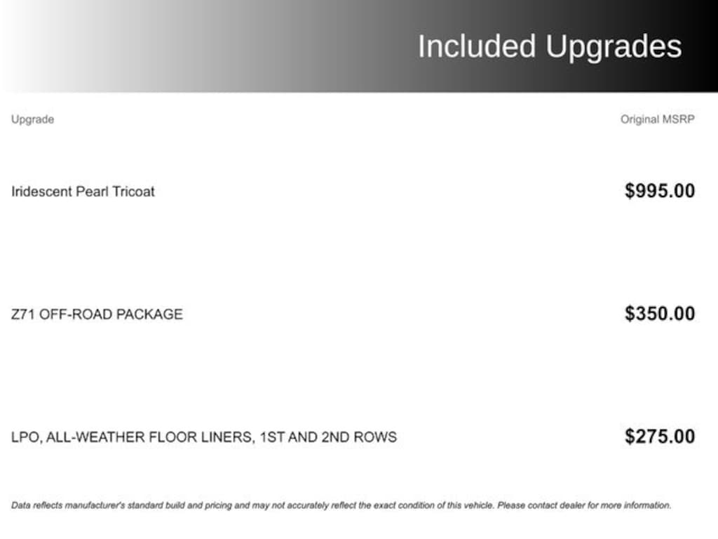 10-Speed Automatic, 4WD, Jet Black/Nightshift Blue Leather, 10-Way Power Driver Seat w/Lumbar, 10-Way Power Passenger Seat Adjuster w/Lumbar, 12.3" Multicolor Reconfigurable Digital Display, 120-Volt Bed Mounted Power Outlet, 120-Volt Instrument Panel Power Outlet, 170 Amp Alternator, 2 USB Data Ports, 2nd Row Heated Outboard Seats, 3.23 Rear Axle Ratio, 4-Wheel Disc Brakes, 7 Speakers, ABS brakes, Air Conditioning, All-Weather Floor Liner (LPO) (AAK), Alloy wheels, AM/FM radio: SiriusXM with 360L, Apple CarPlay/Android Auto, Auto High-beam Headlights, Auto-dimming door mirrors, Auto-Dimming Inside Rear-View Mirror, Auto-dimming Rear-View mirror, Auto-Locking Rear Differential, Automatic Emergency Braking, Automatic temperature control, Bed View Camera, Bluetooth® For Phone, Body-Color Painted Mirror Caps, Bodyside moldings, Brake assist, Bumpers: body-color, Chevrolet Connected Access Capable, Chevytec Spray-On Black Bedliner, Chrome Assist Steps, Chrome Recovery Hooks, Color-Keyed Carpeting Floor Covering, Compass, Deep-Tinted Glass, Delay-off headlights, Driver door bin, Driver Memory, Driver vanity mirror, Dual Exhaust w/Polished Outlets, Dual front impact airbags, Dual front side impact airbags, Dual Rear USB Ports (Charge Only), Electric Rear-Window Defogger, Electrical Steering Column Lock, Electronic Cruise Control, Electronic Stability Control, Electronic Transmission Range Selector Shifter, Floor Mounted Center Console, Following Distance Indicator, Forward Collision Alert, Front anti-roll bar, Front Bucket Seats, Front Carpeted Floor Mats, Front Center Armrest, Front dual zone A/C, Front fog lights, Front LED Fog Lamps, Front Pedestrian Braking, Front Rainsensing Wipers, Front reading lights, Front wheel independent suspension, Fully automatic headlights, Garage door transmitter, Genuine wood console insert, Genuine wood dashboard insert, Genuine wood door panel insert, HD Surround Vision, Heated door mirrors, Heated Driver & Front Outboard Passenger Seats, Heated front seats, Heated rear seats, Heated Steering Wheel, Heated steering wheel, Heavy-Duty Air Filter, High Capacity Suspension Package, Hill Descent Control, Hitch Guidance, Hitch Guidance w/Hitch View, Illuminated entry, Integrated Trailer Brake Controller, IntelliBeam Automatic High Beam On/Off, Keyless Open & Start, Lane Keep Assist w/Lane Departure Warning, Leather Wrapped Steering Wheel, LED Cargo Area Lighting, Low tire pressure warning, Memory seat, Not Equipped w/Dynamic Fuel Management, Not Equipped w/Front & Rear Park Assist, Not Equipped w/Steering Column Lock, Occupant sensing airbag, Off-Road Suspension, OnStar & Chevrolet Connected Services Capable, Outside Heated Power-Adjustable Mirrors, Outside temperature display, Overhead airbag, Overhead console, Panic alarm, Passenger door bin, Passenger vanity mirror, Perforated Leather Seat Trim, Perimeter Lighting, Power door mirrors, Power driver seat, Power Front Passenger Windows w/Express Up/Down, Power Front Windows w/Driver Express Up/Down, Power passenger seat, Power Rear Windows w/Express Down, Power Sliding Rear Window w/Rear Defogger, Power steering, Power Tailgate, Power Tilt & Telescoping Steering Column, Power windows, Preferred Equipment Group 3LZ, Premium audio system: Chevrolet Infotainment 3 Premium, Premium Bose 7-Speaker Sound System, Radio data system, Radio: Chevrolet Infotainment 3 Premium System, Rain sensing wipers, Rear Carpeted Floor Mats, Rear Cross Traffic Alert-Braking, Rear Pedestrian Detection, Rear reading lights, Rear seat center armrest, Rear step bumper, Rear Wheelhouse Liners, Rear window defroster, Remote keyless entry, Remote Vehicle Starter System, Safety Alert Seat, Security system, SiriusXM w/360L, Speed control, Speed-sensing steering, Split folding rear seat, Standard Tailgate, Steering Wheel Audio Controls, Steering wheel mounted audio controls, Tachometer, Telescoping steering wheel,