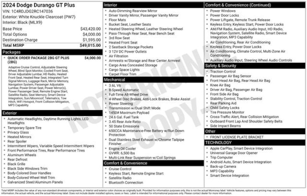 AWD, 1-Year Trial (Registration Required), 10.1" Touchscreen Display, 115V Auxiliary Power Outlet, 180 Amp Alternator, 3.45 Rear Axle Ratio, 3rd row seats: split-bench, 4-Wheel Disc Brakes, 4G LTE Wi-Fi Hot Spot, 6 Speakers, 7 & 4 Pin Wiring Harness, ABS brakes, Adaptive Cruise Control w/Stop, Air Conditioning, Alloy wheels, AM/FM radio: SiriusXM, Apple CarPlay, Apple CarPlay/Android Auto, Auto-Dimming Exterior Driver Mirror, Auto-dimming Rear-View mirror, Automatic temperature control, Black Roof Rails, Blind Spot w/Trailer Detection, Brake assist, Bumpers: body-color, Class IV Receiver Hitch, Cloth Bucket Seats w/Shift Insert, Compass, Connected Travel & Traffic Services, Delay-off headlights, Disassociated Touchscreen Display, Driver door bin, Driver vanity mirror, Dual front impact airbags, Dual front side impact airbags, Dual Remote USB Port - Charge Only, Electronic Stability Control, Exterior Mirrors w/Heating Element, Exterior Mirrors w/Memory, Exterior Mirrors w/Supplemental Signals, Floor Console w/Leather Armrest, For Details Visit DriveUconnect.com, Four wheel independent suspension, Front anti-roll bar, Front Bucket Seats, Front Center Armrest w/Storage, Front dual zone A/C, Front License Plate Bracket, Front reading lights, Full Speed Forward Collision Warning Plus, Fully automatic headlights, Garage door transmitter, Global Telematics Box Module (TBM), Gloss Black Exterior Mirrors, Google Android Auto, GPS Antenna Input, GPS Navigation, HD Radio, Heated door mirrors, Heated front seats, Heated Second Row Seats, Heated steering wheel, Heavy-Duty Engine Cooling, Illuminated entry, Integrated Center Stack Radio, Integrated Roof Rail Crossbars, Integrated Voice Command w/Bluetooth, Knee airbag, Leather steering wheel, Leather Trimmed Bucket Seats, Leather Wrapped Door Panels, LED Auxiliary Low Beam & Turn Signal, Low tire pressure warning, Occupant sensing airbag, Outside temperature display, Overhead airbag, Overhead console, Panic alarm, ParkView Rear Back-Up Camera, Passenger door bin, Passenger vanity mirror, Power 6x9 Multi-Function Foldaway Mirrors, Power 8-Way Driver Memory 8-Way Passenger Seats, Power door mirrors, Power driver seat, Power Driver/Passenger 4-Way Lumbar Adjust, Power Liftgate, Power steering, Power Sunroof, Power Tilt & Telescopic Steering Column, Power windows, Quick Order Package 2BG GT Plus, Radio data system, Radio: Uconnect 4 w/8.4" Display, Radio: Uconnect 5 Nav w/10.1" Display, Radio/Driver Seat/Mirrors Memory, Rear air conditioning, Rear anti-roll bar, Rear Load Leveling Suspension, Rear reading lights, Rear seat center armrest, Rear window defroster, Rear window wiper, Red Accent Stitching, Remote keyless entry, SiriusXM Guardian - Included Trial (B), SiriusXM w/360L, Speed control, Speed-sensing steering, Speed-Sensitive Wipers, Split folding rear seat, Spoiler, Sport steering wheel, Steering wheel mounted audio controls, Tachometer, Telescoping steering wheel, Tilt steering wheel, Traction control, Trailer Brake Control, Trip computer, USB Host Flip, Variably intermittent wipers, Ventilated Front Seats, Voltmeter, Wheels: 20" x 8.0" Fine Silver, AWD. White Knuckle Clearcoat 2024 Dodge Durango GT Plus AWD 8-Speed Automatic 3.6L V6 24V VVT