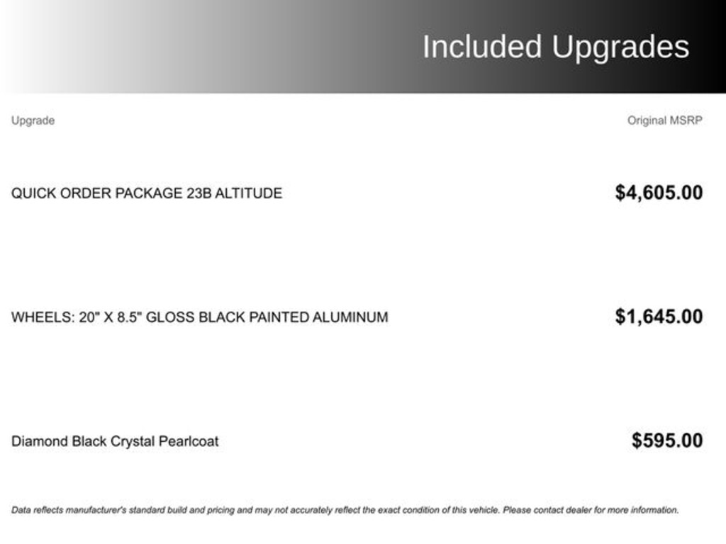 115V Auxiliary Power Outlet, 3.45 Rear Axle Ratio, 3rd Row Charge-Only USB Ports, 3rd row seats: split-bench, 4-Wheel Disc Brakes, 6 Speakers, ABS brakes, Air Conditioning, Alloy wheels, Altitude Appearance Package, Anti-whiplash front head restraints, Automatic temperature control, Black Headliner, Brake assist, Bumpers: body-color, Capri Leatherette/Suede Seats, Cloth Seats, Compass, Delay-off headlights, Delete Laredo Badge, Driver door bin, Driver vanity mirror, Dual front impact airbags, Dual front side impact airbags, Electronic Stability Control, Emergency communication system, Four wheel independent suspension, Front anti-roll bar, Front Bucket Seats, Front Center Armrest w/Storage, Front dual zone A/C, Front License Plate Bracket, Front reading lights, Fully automatic headlights, Gloss Black Exterior Accents, Heated door mirrors, Heated Front Seats, Heated Steering Wheel, Illuminated entry, Knee airbag, Low tire pressure warning, Manual Fold Seatbacks, Molded In Color Black/Gloss Black Roof Rails, Normal Duty Suspension, Occupant sensing airbag, Outside temperature display, Overhead airbag, Overhead console, Panic alarm, ParkView Rear Back-Up Camera, Passenger door bin, Passenger vanity mirror, Power door mirrors, Power driver seat, Power Liftgate, Power steering, Power windows, Quick Order Package 23B Altitude, Radio data system, Radio: Uconnect 5 w/8.4" Display, Rain Sensitive Windshield Wipers, Rear air conditioning, Rear anti-roll bar, Rear reading lights, Rear window defroster, Rear window wiper, Reclining 3rd row seat, Remote keyless entry, Remote Start System, Security system, Selectable Tire Fill Alert, Speed control, Speed-Sensitive Wipers, Split folding rear seat, Spoiler, Steering wheel mounted audio controls, Tachometer, Telescoping steering wheel, Tilt steering wheel, Traction control, Trip computer, Variably intermittent wipers, Voltmeter, Wheels: 18" x 8.0" Fully Painted Aluminum, Wheels: 18" x 8.0" Fully Painted Aluminum 1, Wheels: 20" x 8.5" Gloss Black Painted Aluminum, Wireless Charging Pad. Diamond Black Crystal Pearlcoat 2023 Jeep Grand Cherokee L Altitude RWD 8-Speed Automatic 3.6L V6 24V VVT