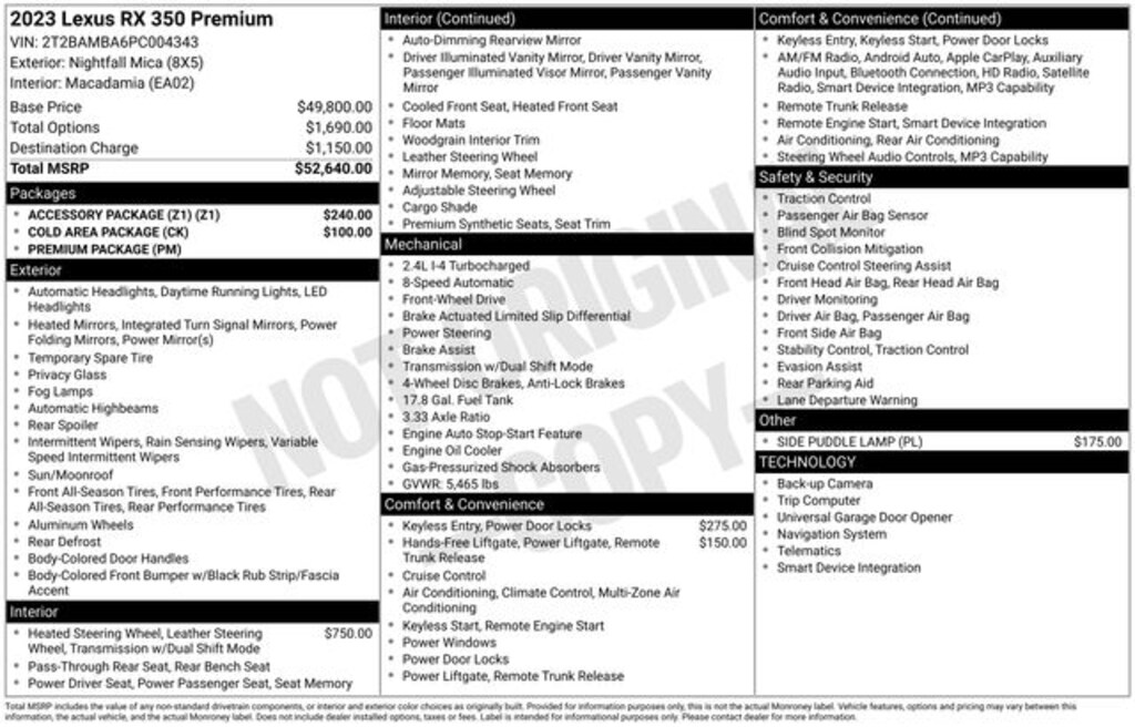 This exceptional 2023 Lexus RX 350 Premium is a true standout in the luxury SUV market. With its captivating design, impressive performance, and uncompromising attention to detail, it's the perfect choice for discerning drivers seeking the ultimate in sophistication and driving enjoyment.