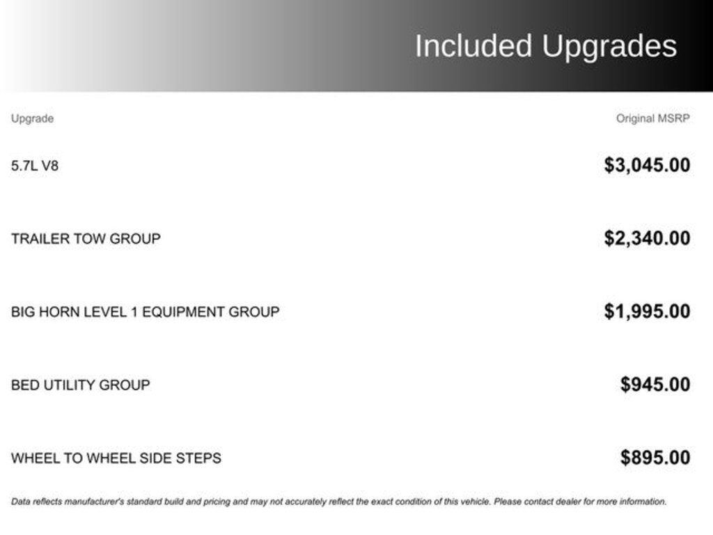 2nd Row In Floor Storage Bins, 3 Rear Seat Head Restraints, 3.21 Rear Axle Ratio, 4 Way Front Headrests, 4-Wheel Disc Brakes, 48V Belt Starter Generator, 4G LTE Wi-Fi Hot Spot, 6 Speakers, 8.4" Touchscreen Display, ABS brakes, Air Conditioning, Alloy wheels, AM/FM radio, Apple CarPlay, Auto-Dimming Exterior Driver Mirror, Auto-Dimming Rear-View Mirror, Bed Utility Group, Big Horn Badge, Big Horn Level 1 Equipment Group, Black Exterior Mirrors, Black Premium Power Mirrors, Black Trailer Tow Power Mirrors (DISC), Bluetooth Handsfree Phone & Audio, Brake assist, Bumpers: chrome, Class IV Receiver Hitch, Cloth Bench Seat, Compass, Connectivity - US/Canada, Convex Wide-Angle Exterior Mirror Insert, Delay-off headlights, Driver door bin, Dual front impact airbags, Dual front side impact airbags, Electronic Stability Control, Emergency communication system: SiriusXM Guardian, Exterior Mirrors Courtesy Lamps, Exterior Mirrors w/Heating Element, Exterior Mirrors w/Supplemental Signals, Exterior Parking Camera Rear, For Details, Visit DriveUconnect.com, For More Info, Call 800-643-2112, Front anti-roll bar, Front Center Armrest w/Storage, Front Fog Lamps, Front License Plate Bracket, Front reading lights, Front Seat Back Map Pockets, Front wheel independent suspension, Fully automatic headlights, Global Telematics Box Module (TBM), Glove Box Lamp, Google Android Auto, GPS Antenna Input, Heated door mirrors, Heated Front Seats, Heated Steering Wheel, Illuminated entry, Integrated Center Stack Radio, Integrated Voice Command w/Bluetooth, Leather steering wheel, Low tire pressure warning, Manufacturer's Statement of Origin, MOPAR 4 Adjustable Cargo Tie-Down Hooks, MOPAR Deployable Bed Step, MOPAR Spray In Bedliner, Occupant sensing airbag, Outside temperature display, Overhead airbag, Overhead console, Panic alarm, Passenger door bin, Passenger Sun Visor w/Illuminated Mirror, Passenger vanity mirror, Pick-Up Box Lighting, Power door mirrors, Power steering, Power windows, Power-Folding Mirrors, Quick Order Package 27Z Big Horn, Radio data system, Radio: Uconnect 3 w/5" Display, Radio: Uconnect 5 W w/8.4" Display, RAM Grille Badge - Chrome, Rear 60/40 Folding Seat, Rear anti-roll bar, Rear Dome w/On/Off Switch Lamp, Rear Power Sliding Window, Rear seat center armrest, Rear step bumper, Rear Window Defroster, Remote keyless entry, SiriusXM Satellite Radio, Speed control, Split folding rear seat, Steering wheel mounted audio controls, Tachometer, Telescoping steering wheel, Tilt steering wheel, Traction control, Trailer Brake Control, Trailer Light Check, Trailer Reverse Steering Control, Trailer Tire Pressure Monitoring System, Trailer Tow Group, Trailer Tow Mirrors, Trip computer, USB Host Flip, Variably intermittent wipers, Voltmeter, Wheel to Wheel Side Steps, Wheels: 18" x 8" Cast-Aluminum Painted. Bright White Clearcoat 2023 Ram 1500 Big Horn/Lone Star RWD 8-Speed Automatic HEMI 5.7L V8 Multi Displacement VVT eTorque